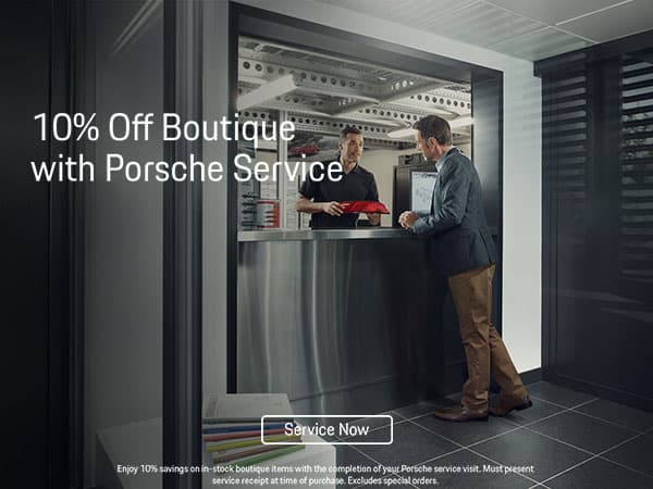 Enjoy 10% savings on in-stock boutique items with the completion of your Porsche service visit. Must present service receipt at time of purchase. Excludes special orders.